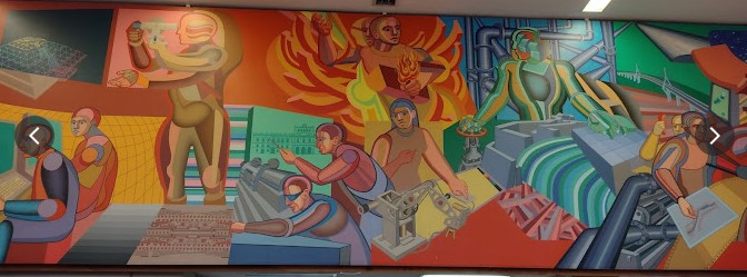 El mural se encuentra en la Biblioteca Enzo Levi, y es un ejemplo del muralismo mexicano